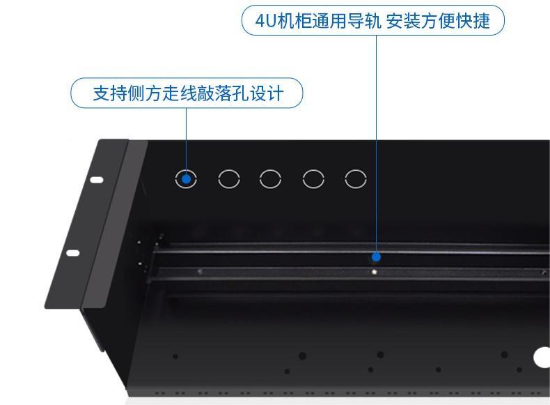 2.通用導軌,安裝更快捷:鍍鋅材質堅固耐,4U機柜采用通用導軌設計,組裝起來更為方便快捷,同時支持側方走線敲落孔。